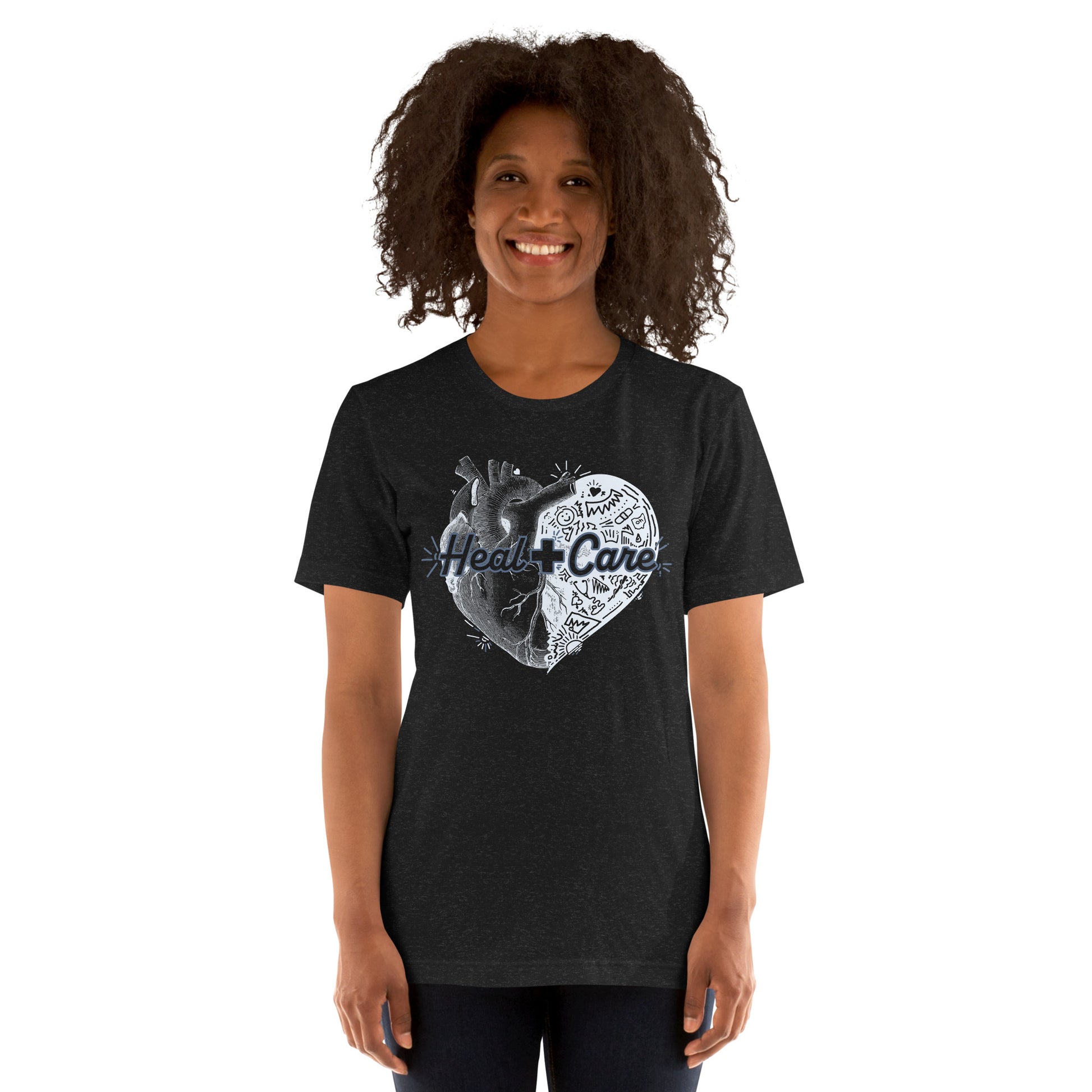 Heal and Care is what you do best and you can be proud of that! The Heal + Care healthcare tee is for everyone in healthcare; no title or department is promoted on this shirt and it makes a great gift for Doctors, STNA's, X-Ray Techs, those in Imaging, Respiratory, Cardiology, and more departments. The print on this shirt is a mix of styles with the very detailed anatomically correct heart paired with the hand-drawn heart shape filled with icons of the job.
